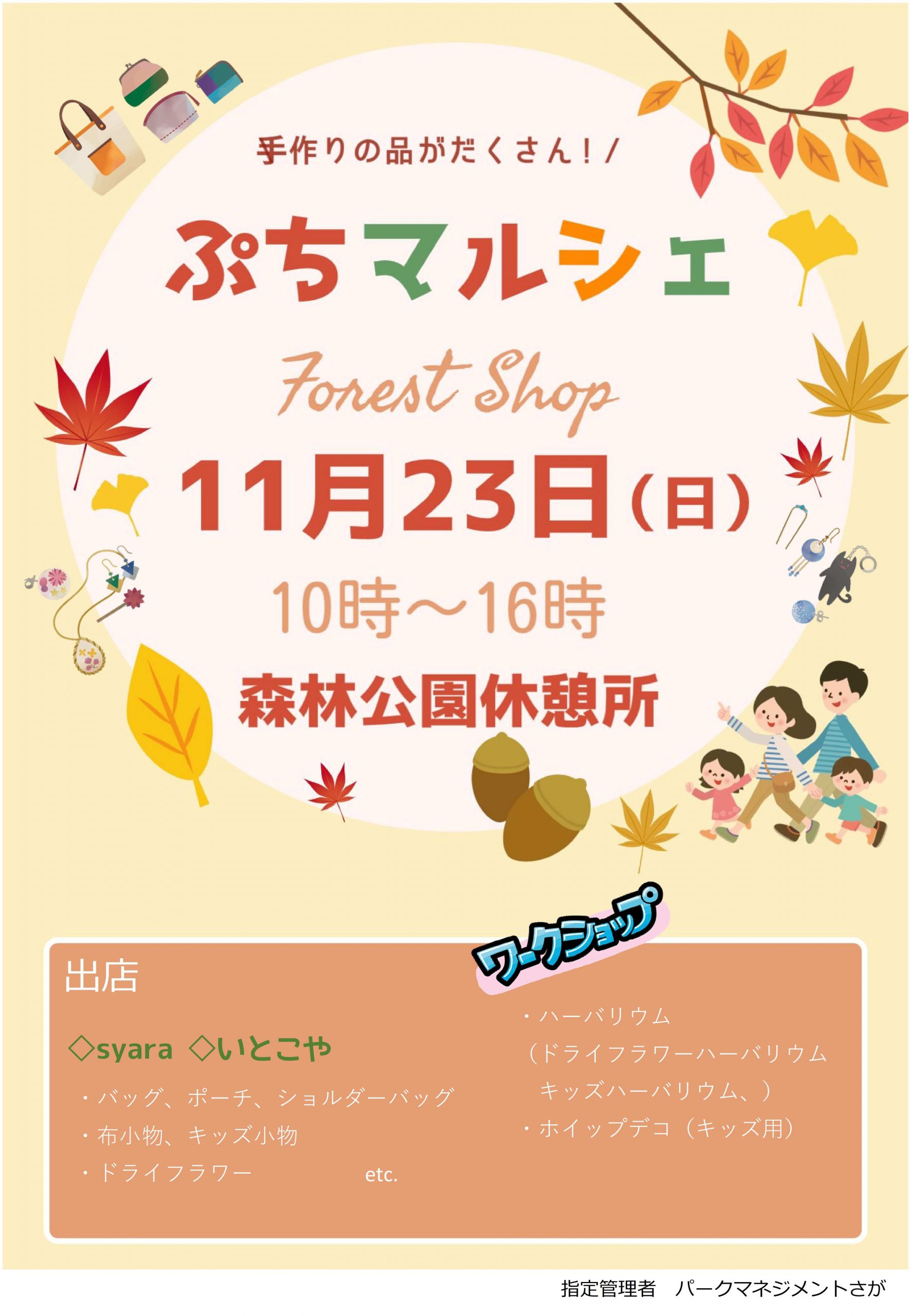 佐賀県立森林公園 > インフォメーション > お知らせ > ぷちマルシェを開催します【11月23日】 お知らせ ぷちマルシェを開催します【11月23日】 2025年11月19日(水) ぷちマルシェ「Forest Shop」を開催します。 休憩所をご利用の皆様には、ご迷惑をお掛け致しますが、ご理解の上、ご協力くださいますよう お願い申し上げます。 Facebookでシェア twitterでツイート はてなブックマーク Google+でシェア カテゴリー お知らせ お知らせ・募集 イベント情報 インフォメーション 各種大会 最近の投稿 ぷちマルシェを開催します【11月23日】 第12回GGペア交歓大会が盛大に開催されました! ディスクゴルフコースオープン! 森林公園小学生駅伝大会 参加者大募集! 「みどりの風だより」を掲載しました。 さがみどりの森スクエア団体予約受付しています テニスコート大会開催情報【2025年4月~2026年3月】 アーカイブ 2025年11月 2025年10月 2025年9月 2025年7月 2025年6月 2025年3月 2025年1月 2024年12月 2024年11月 2024年10月 2024年4月 カテゴリー お知らせ お知らせ・募集 イベント情報 インフォメーション 各種大会
