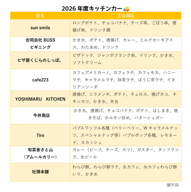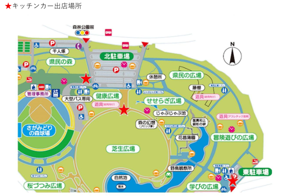 佐賀県立森林公園 > インフォメーション > お知らせ > キッチンカーのお知らせ🚚 お知らせ キッチンカーのお知らせ🚚 2026年04月07日(火) 2026年度もキッチンカーがやってきます🍧 皆さまぜひご利用ください!! Facebookでシェア twitterでツイート はてなブックマーク Google+でシェア カテゴリー お知らせ インフォメーション 各種大会 最近の投稿 キッチンカーのお知らせ🚚 🌸桜開花状況🌸 鑑真ゆかりの花「瓊花」が咲き始めました 「Forest Park Music Camp」を開催しました🎈 2026年度(令和8年度)ケータリングカー出店募集終了のお知らせ 「さがみどりの森球場」令和8年度フェンス広告募集のお知らせ テニスコート大会開催情報【2026年2月~2027年3月】 アーカイブ 2026年4月 2026年3月 2026年2月 2026年1月 2025年12月 2025年9月 2025年6月 2025年1月 2024年11月 カテゴリー お知らせ インフォメーション 各種大会